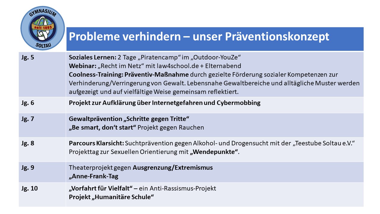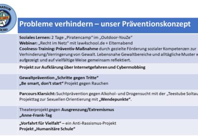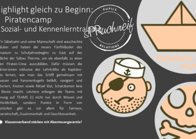 Das Sozialtraining der 5.Klassen umfasst zwei ganze Tage und jede Menge Aufgaben, Rätsel, Spiele und Wettkämpfe. Mit Geschick, Ausdauer, Konzentration und guten Einfällen müssen sich die Schülerinnen und Schüler den unterschiedlichsten Anforderungen stellen. Dabei werden spielerisch Kommunikations- und Lösungskompetenz, Selbstverantwortlichkeit und Teamgeist gestärkt und die Grundlagen für eine gute Klassengemeinschaft gelegt. Kompetent betreut und versorgt von den Mitarbeiter*innen des YouZe als Piratencrew und dem bekannten Kapitän Säbelzahn (Heidepark Soltau) erwerben die jungen Anwärter*innen schlussendlich die angestrebte Würde als Pirat und Piratin – die Klassenleitungen werden von Säbelzahn sogar in den Kapitänsstand erhoben.