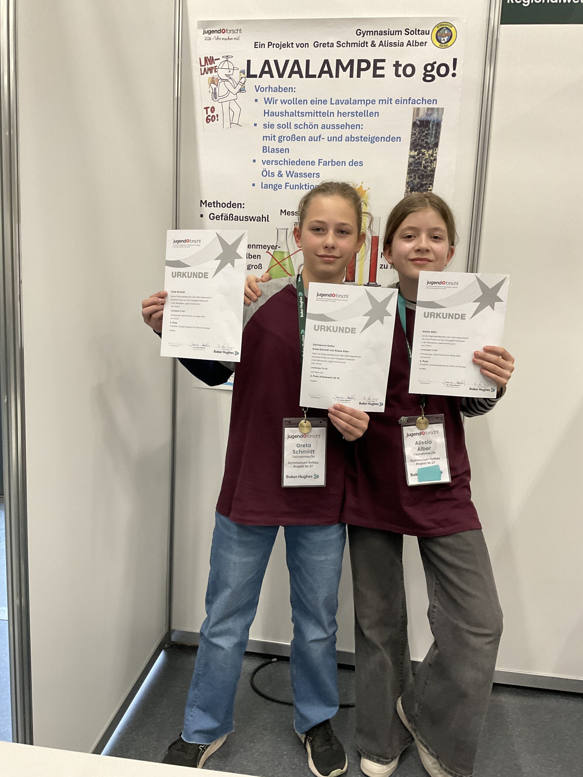 Greta Schmidt & Alissia Alber konnten die Jury in der Sparte Arbeitswelt von ihren funktionierenden Lavalampen überzeugen, die sie auch in einer TO GO -Variante entwickelten. Sie experimentierten an einer Vielzahl von Faktoren, wie beispielsweise die Wahl des richtigen Gefäßes, den optimalen Ablauf zum Starten der Lavalampe, die Farbgebung und der Viskosität der Wasser -und Ölphase. Greta und Alissia belegten am Ende den 3. Platz.