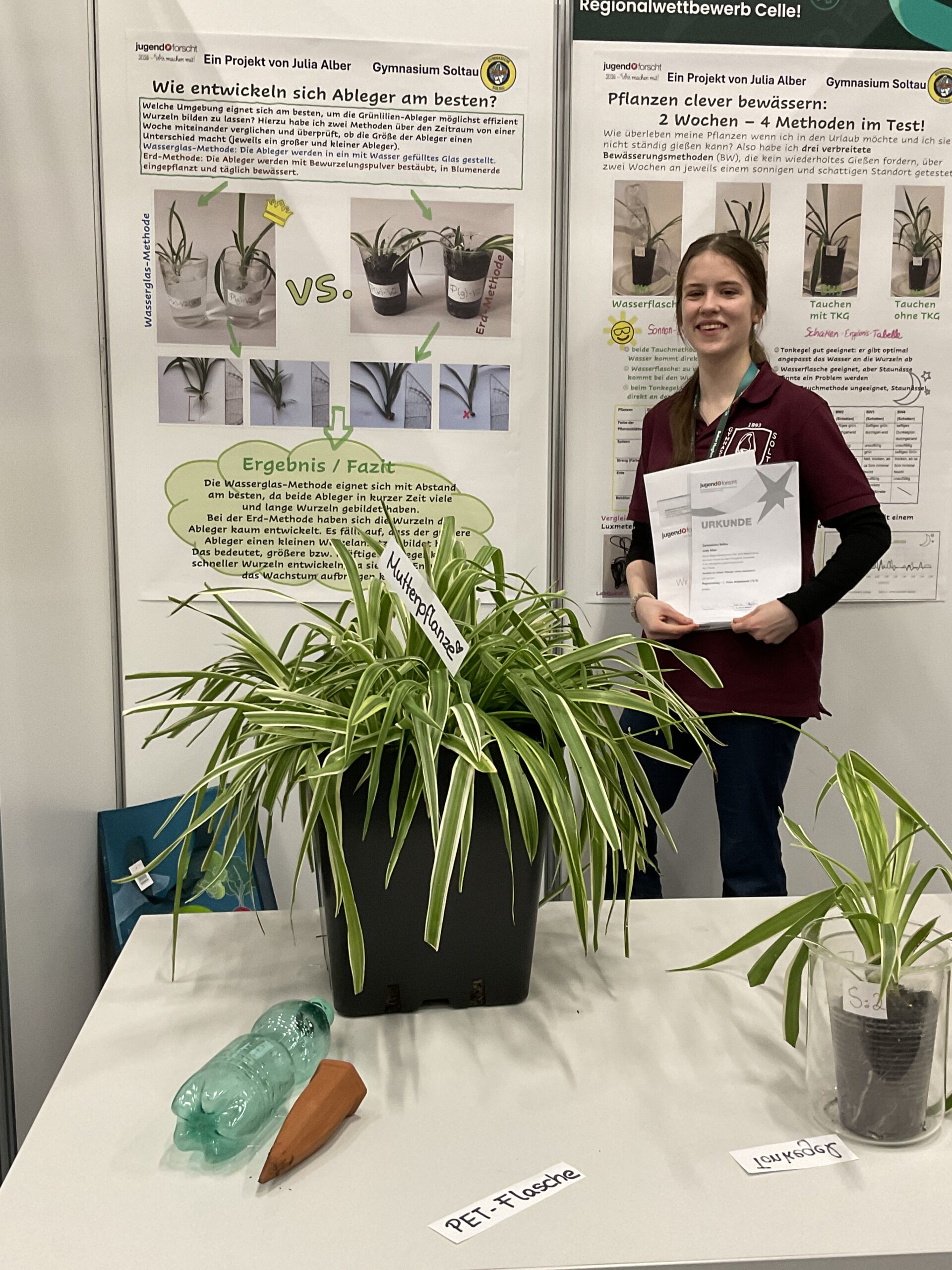 Julia Alber beschäftigte sich mit einem relevanten und praxisnahen Thema: Pflanzen clever bewässern! Sie hat sich mit verschiedenen Methoden der Pflanzen-Bewässerung beschäftigt, um herauszufinden, welche sich am besten eignen Grünlilien über einen längeren Zeitraum ohne wiederholtes Gießen, ausreichend mit Wasser zu versorgen. Die analytische Arbeitsweise überzeugte die Jury: die Versuchsreihen sind strukturiert aufgebaut und die Ergebnisse detailliert dokumentiert. Die Präsentation der Ergebnisse und die Schlussfolgerungen zeigten, wie engagiert und begeisternd Julia ihr Projekt vorstellen konnte.